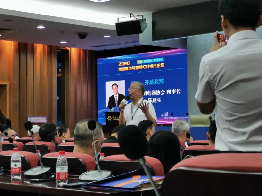 中国照明电器协会理事长陈燕生致辞,他表示智慧路灯是照明的一部分,疫情过后国家政策有一定调整,新基建、新城镇建设方面应该有路灯的内容。中国照协未来会把智慧路灯作为一项重要的工作。