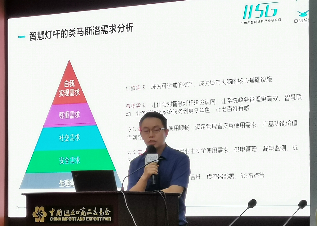 中国科学院软件广州分部、广州市智能软件产业研究院智慧城市物联中心副主任郭桂福做了《智慧灯杆的类马斯洛需求剖析》的主题演讲,介绍了当前智慧灯杆的市场需求情况。